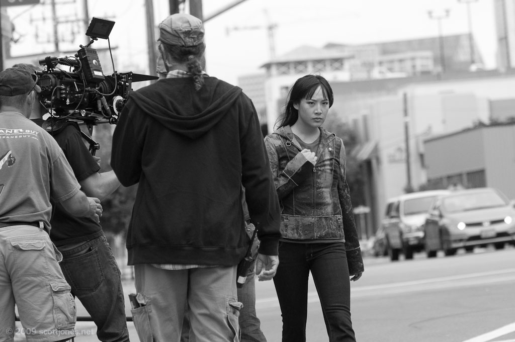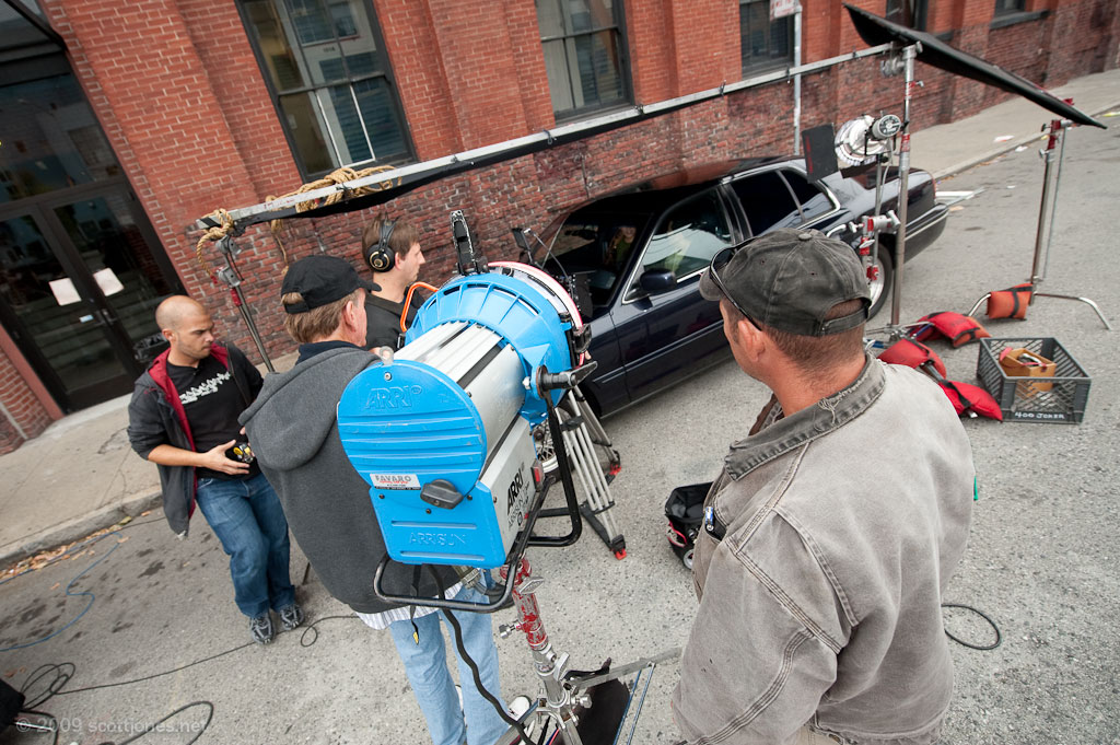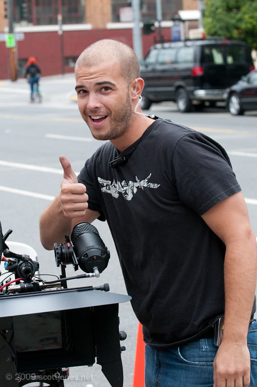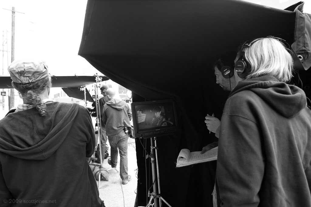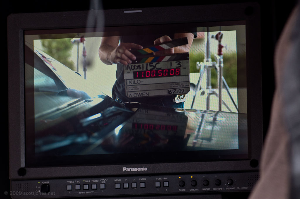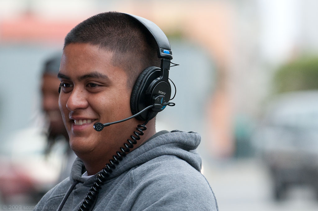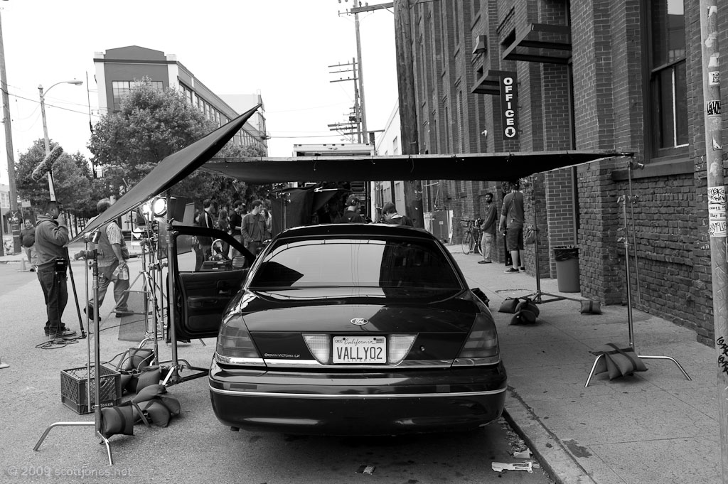 Despite all the honking we got a lot accomplished on Day 2 of principal photography. Wrapped the car stuff that was shooting in the morning and moved onto the plaza scene. A few crew members made some cameos as extras and we even had a guy on stilts. The plaza scene leads into the foot chase so we pulled off the first couple shots from that sequence. To wrap it all up we threw Joaquin into the Crown Vic and had him drive around for some shots from inside the car. He surprised everyone with his apparent aspirations to be a stunt driver. Luckily no crew members were harmed during the filming of that scene.