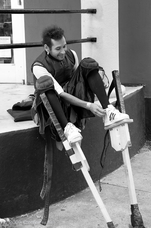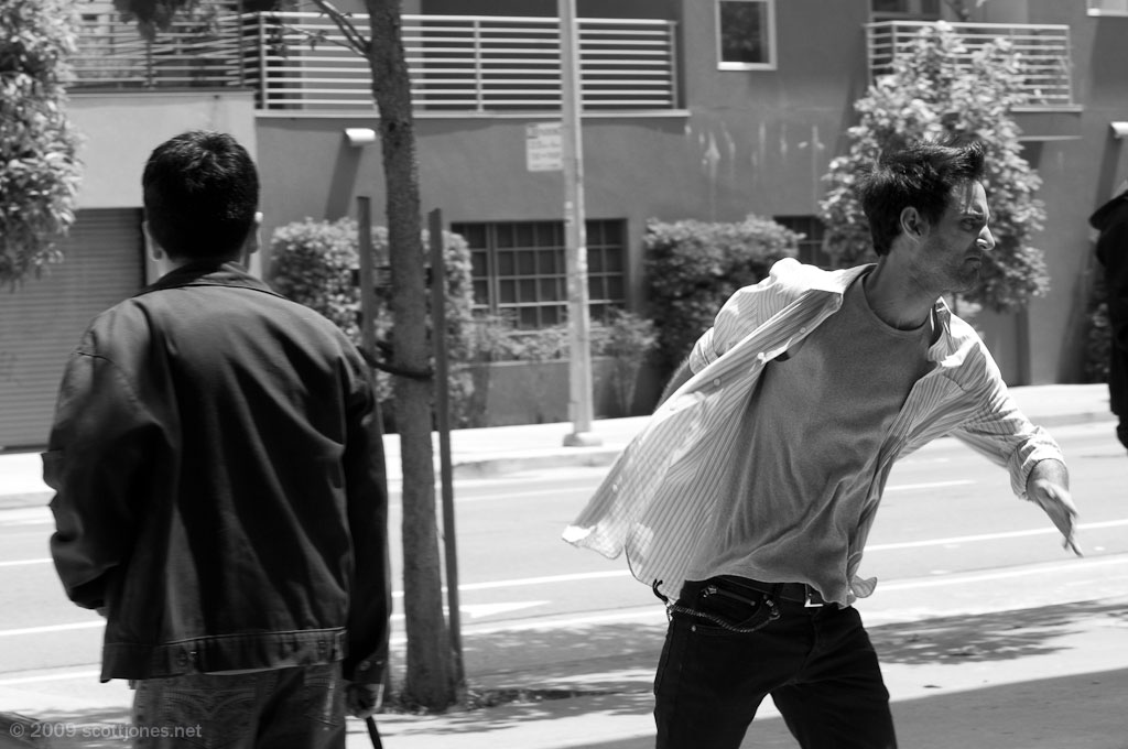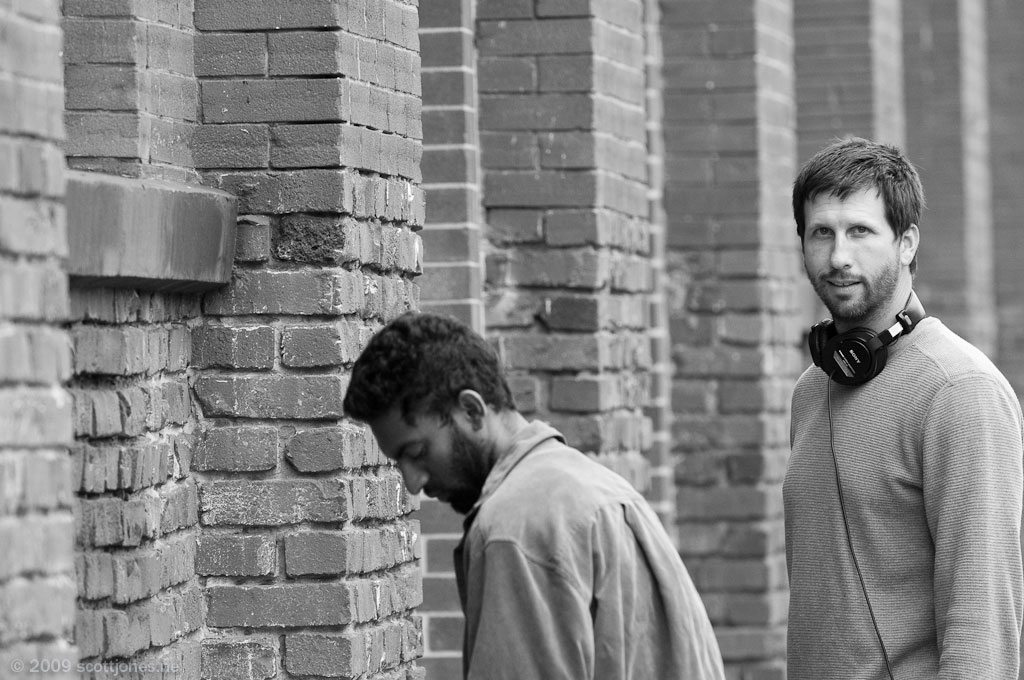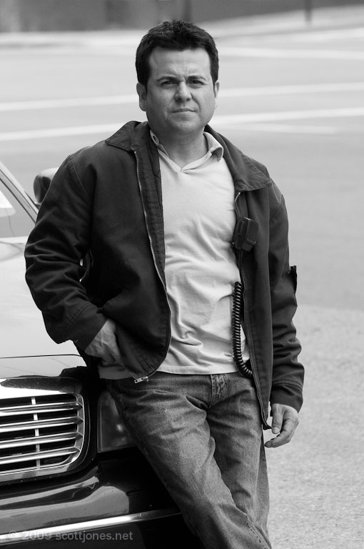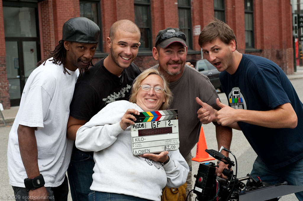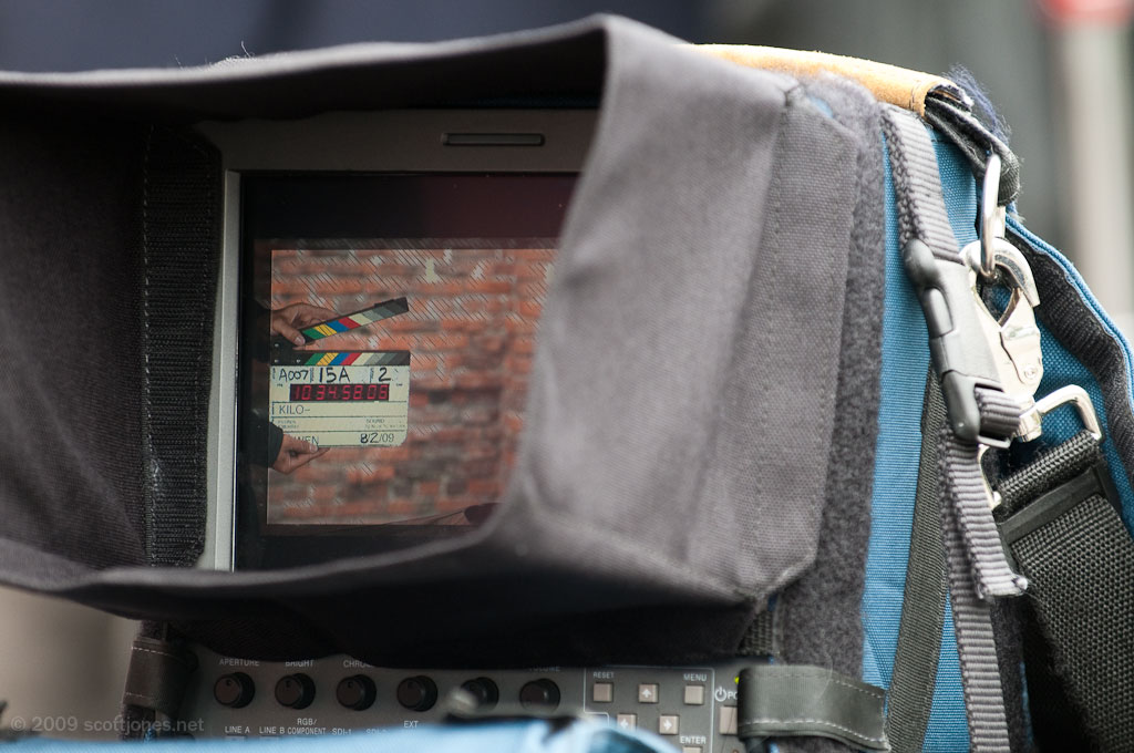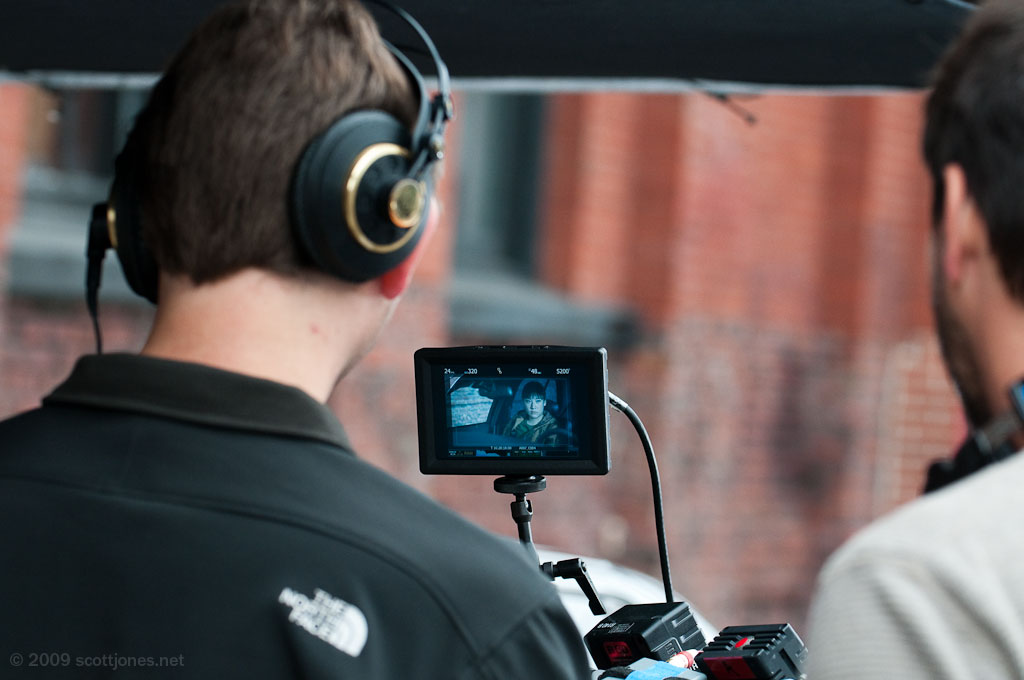 Despite all the honking we got a lot accomplished on Day 2 of principal photography. Wrapped the car stuff that was shooting in the morning and moved onto the plaza scene. A few crew members made some cameos as extras and we even had a guy on stilts. The plaza scene leads into the foot chase so we pulled off the first couple shots from that sequence. To wrap it all up we threw Joaquin into the Crown Vic and had him drive around for some shots from inside the car. He surprised everyone with his apparent aspirations to be a stunt driver. Luckily no crew members were harmed during the filming of that scene.